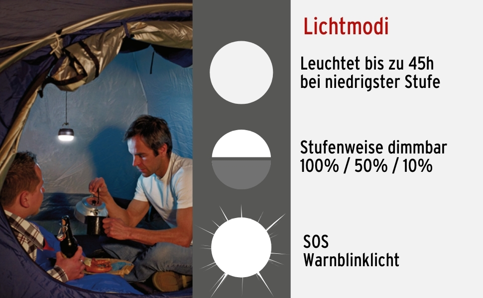LED Campinglampe mit 3 Helligkeitsstufen: 100%, 50% und 10%